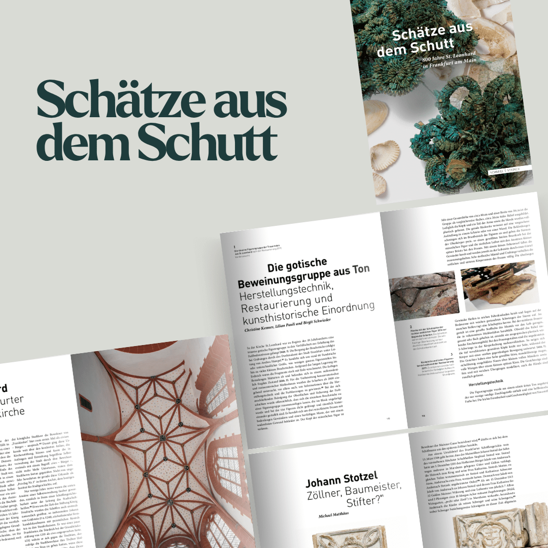 Mit der Ausstellung im Dommuseum Frankfurt konnte die Öffentlichkeit nach Jahren der Grabungen in St. Leonhard erstmals die neu gewonnen Fundstücke in Augenschein nehmen. Wir haben die Gelegenheit genutzt, anhand dieser Schätze die 800-jährige Geschichte St. Leonhards zu erzählen. Dabei war uns ein besonderes Anliegen, darüber hinaus die archäologischen und bauforscherischen Arbeitsweisen ebenso zu vermitteln wie die restauratorischen Verfahren, mit denen die Funde für die kommenden Jahrhunderte konserviert wurden. All das schlägt sich im Ausstellungskatalog nieder.
